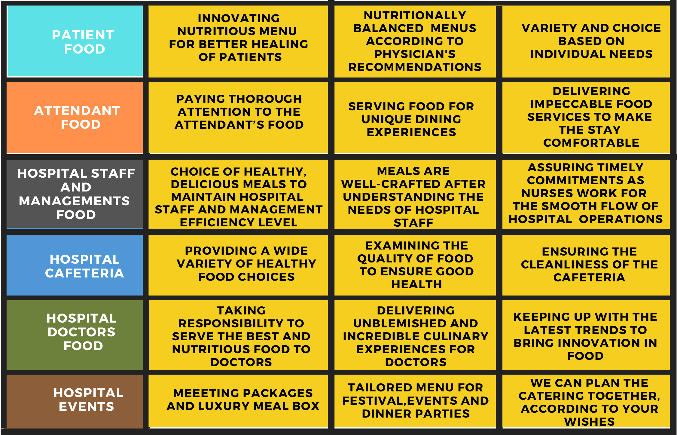 Traditionally, the hospital was someplace where you had to eat, not a place where you would choose to eat. Our customers choose us to provide nutritious and delicious menus that have a positive impact on patients, staff and visitors.